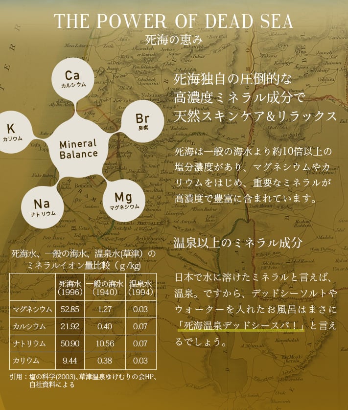 癒しの海と呼ばれる死海(塩湖)の成分は一般の海水と比べて、4倍のナトリウム、20〜45倍のカリウム、マグネシウム、カルシウムが豊富に含まれています。
