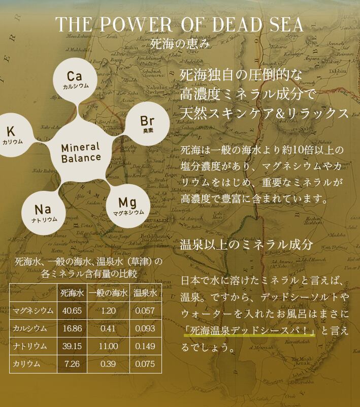癒しの海と呼ばれる死海(塩湖)の成分は一般の海水と比べて、4倍のナトリウム、20〜45倍のカリウム、マグネシウム、カルシウムが豊富に含まれています。