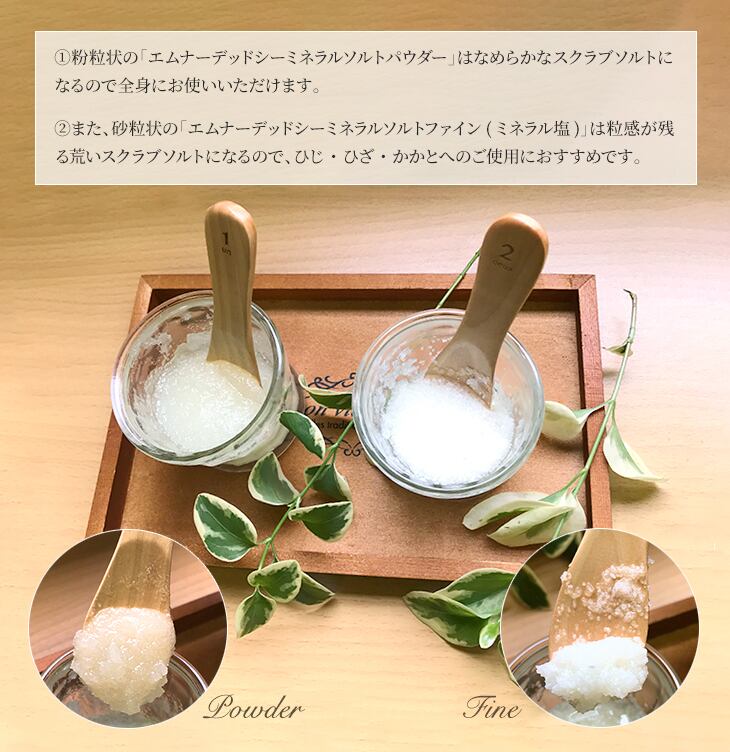 粒の大きさの異なるパウダーとファイン(ミネラル塩)は、それぞれ異なった特徴のスクラブソルトに仕上がります。お好みでどうぞ。