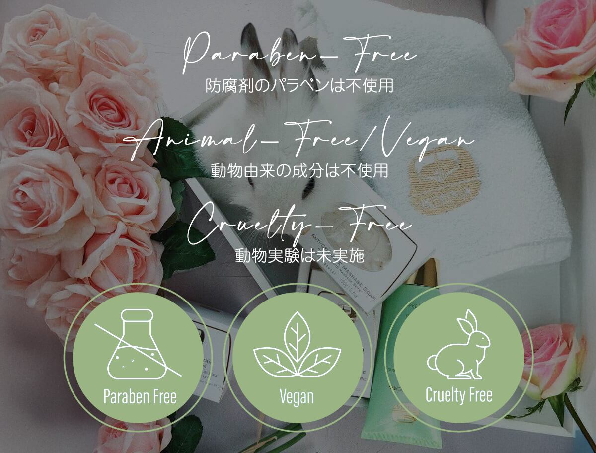 すべての製品はISO認証を取得し、パラベン不使用・動物由来成分不使用・動物実験は行っていません。